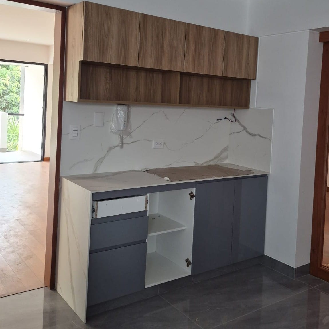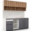 Optimiza tu espacio con este mueble de cocina de diseño contemporáneo que combina texturas de melamina texturizada y funcionalidad excepcional. La parte superior cuenta con amplios gabinetes y nichos abiertos en melamina acabado madera natural, mientras que la base ofrece una organización eficiente con cajones y puertas en melamina gris grafito.
