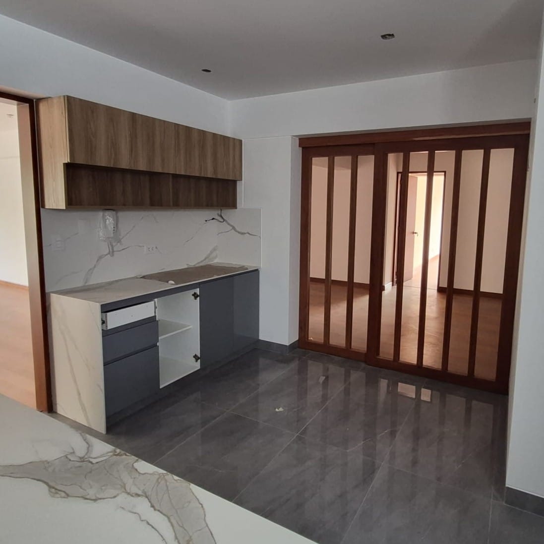 Destaca su elegante encimera y salpicadero de cuarzo blanco con vetas grises, que sobre la estructura de melamina proporciona una superficie higiénica y de gran impacto visual. Es la solución perfecta para hogares modernos que buscan la durabilidad de los materiales sintéticos con la calidez de la madera.